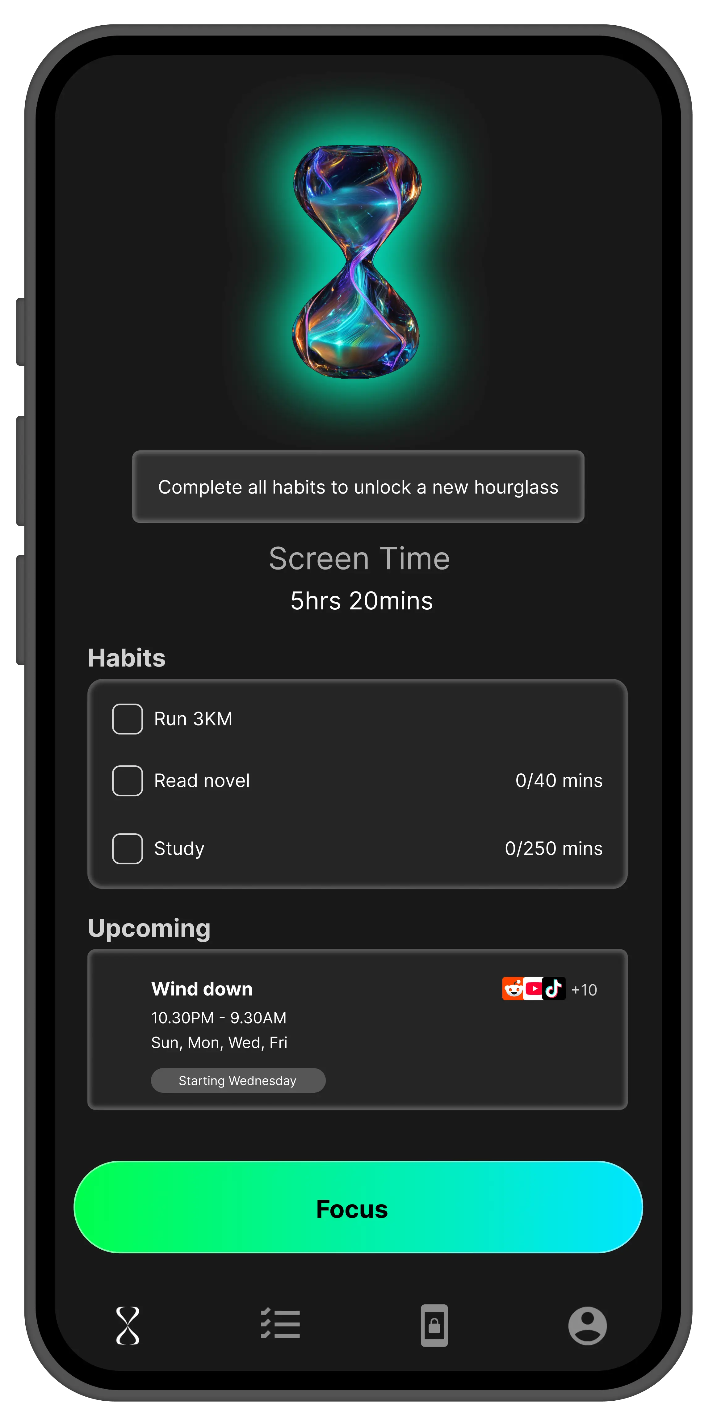 Stay consistent, and earn collectible hourglasses that reflect your progress.